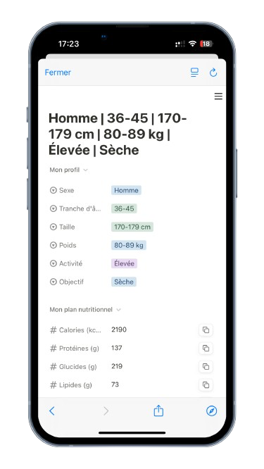 La plateforme génère automatiquement un profil nutritionnel personnalisé pour chacun de vos adhérents à partir de leurs données (âge, poids, taille, sexe, niveau d’activité et objectif).